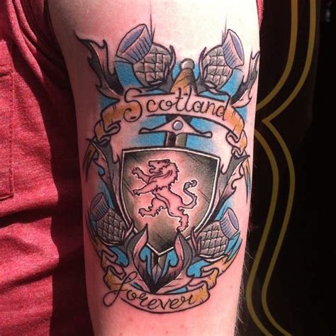 Lovely scottish thistle and bow tattoo. The triskele tattoo can be interpreted in many ways, but similarly to the slavic and some other cultures, the number 3 in the celtic culture is considered sacred. Scottish flags tattoo on upper back. Round different scottish tattoo design.