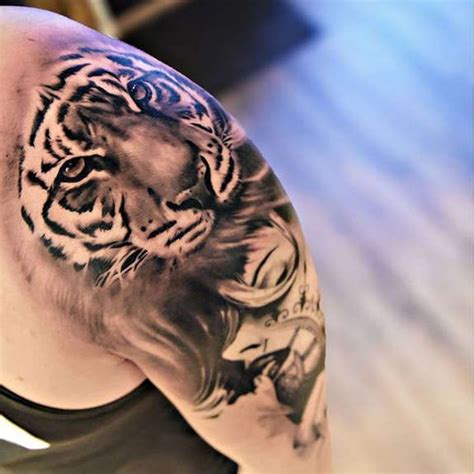 Tiger head tattoo shoulder tattoo a symbol of aggression and power, this tiger, sitting on the arm, arouses fear and awe. Realistic tattoo on the shoulder. New school geometric tiger tattoos. Badass, black and grey tiger tattoo done on the back that symbolizes passion and ferocity. 9 years ago 9 years ago.