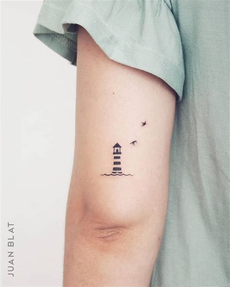 Small Lighthouse Tattoo, Additional elements can include stars, dolphins, and other sea. Lighthouse tattoos often portray the coastal landscape, which can include sand and jagged rocky edges.